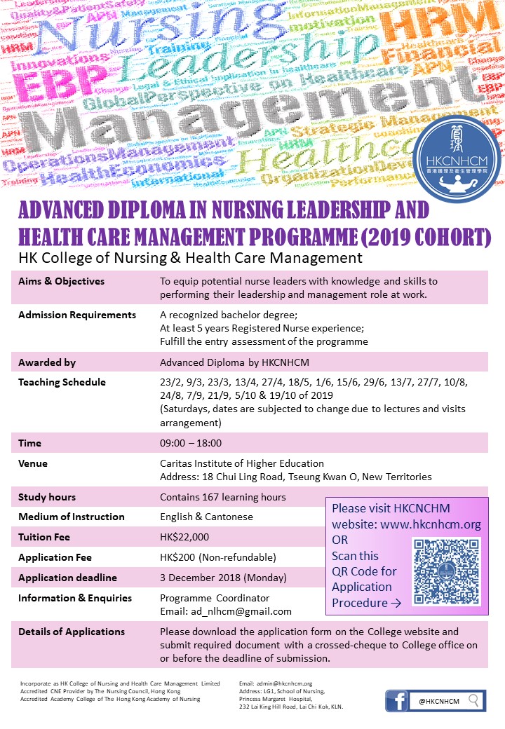 Advanced Diploma in Nursing Leadership & Health Care Management Program 2019 | HKCNHCM | Caritas Institute of Higher Education |