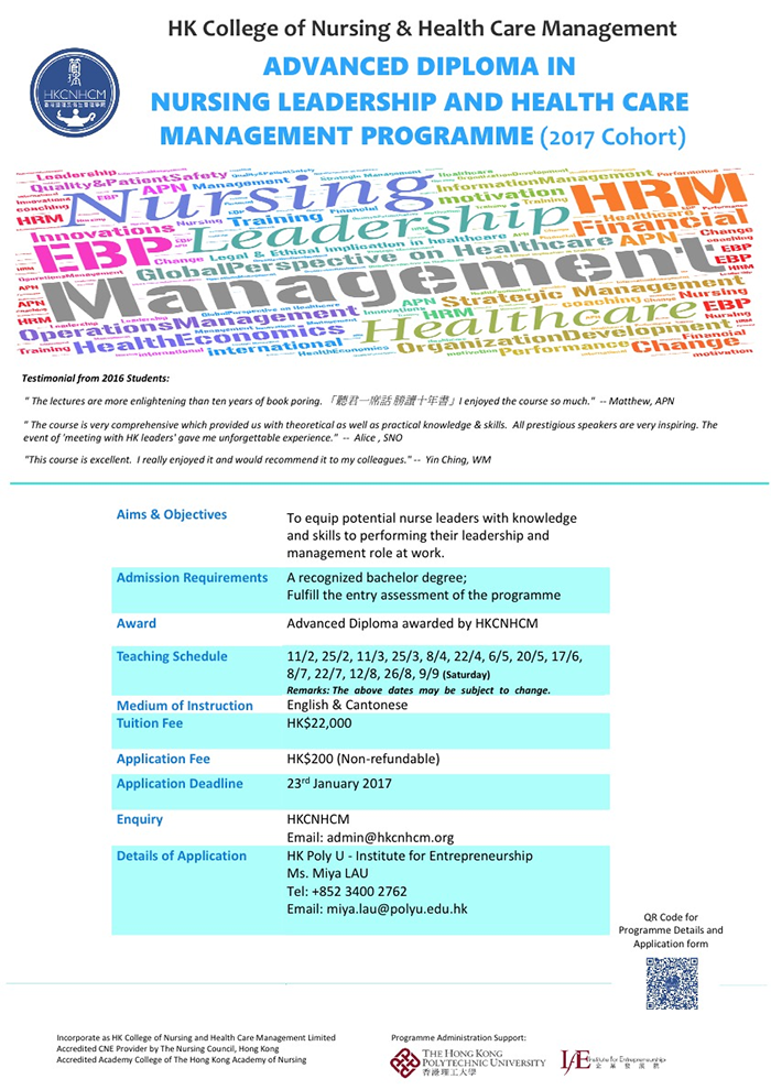 Please visit the page: http://www.hkcnhcm.org/index.php/course-information/advdip-programme or click the poster below for retrieving more information.