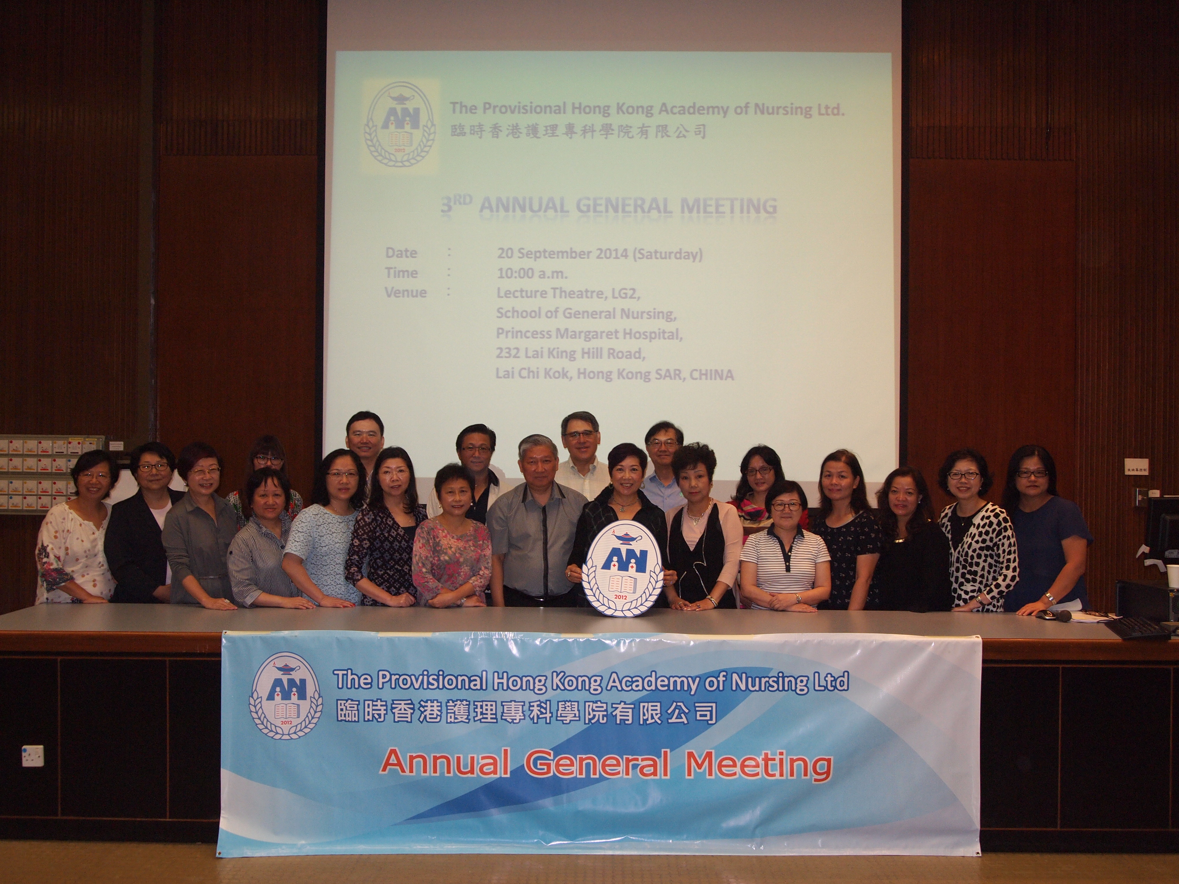 The Provisional Hong Kong Academy of Nursing hosted their 3rd Annual General Meeting on 20 September 2014 at Princess Margaret Hospital. College President and several College Fellows attended the AGM and shared the vision of the PHKAN's development to the Academy.